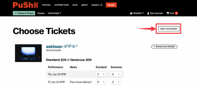 You can also send your shortlist with someone to share what shows you want to see, and they can buy tickets from the shared page as well. Changes to the shortlist made by your friend will not change your shortlist!
