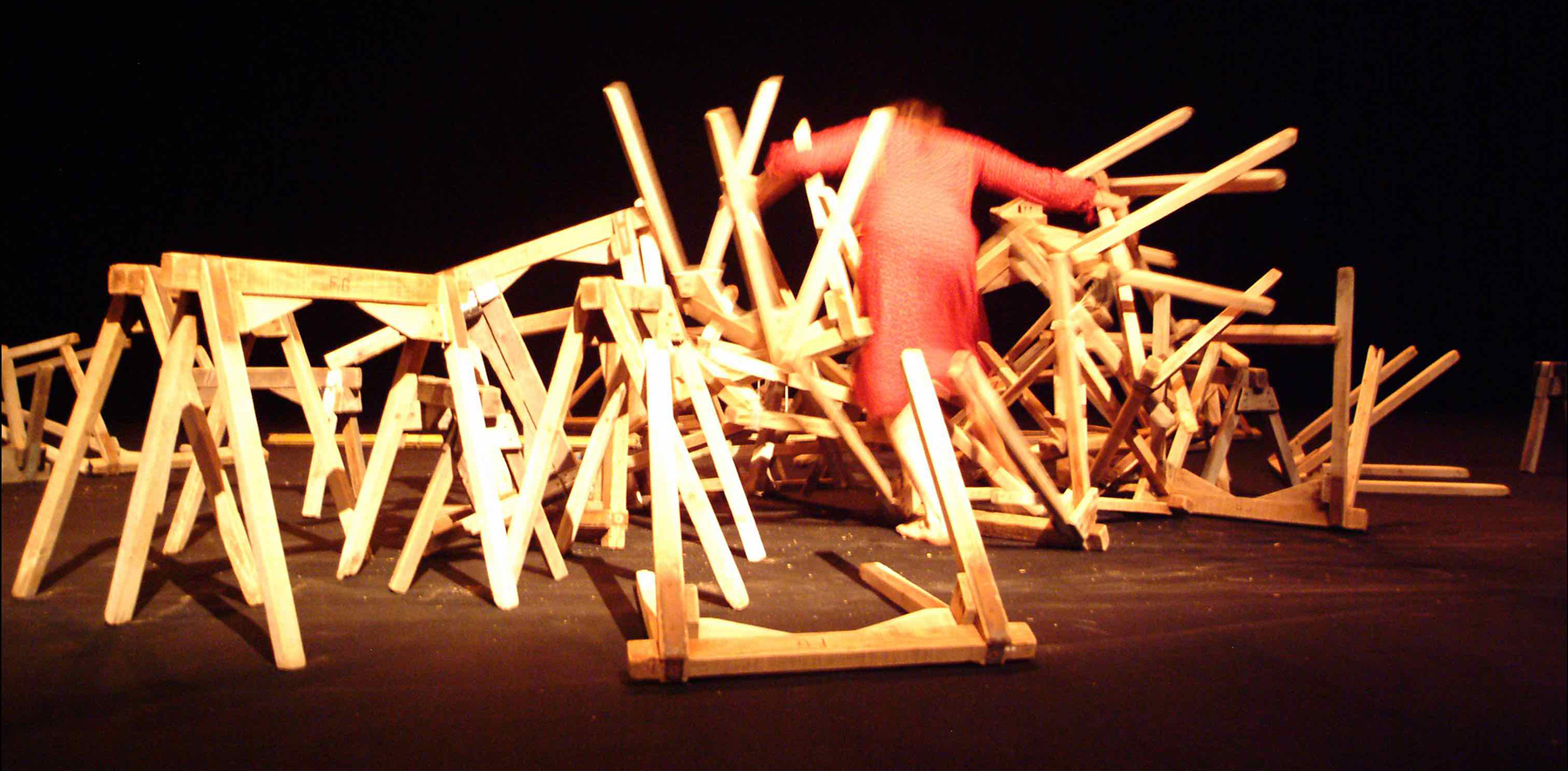 An adventure for performer and audience alike, Camille Boitel’s raucous embodiment of the title character in this amazingly physical performance piece will have you laughing out loud one minute and staring in wonder the next. The premise is simple: Boitel wants to set up a table and chair, so he can face his audience. But in his skewed universe, nothing is simple. Everything—and we mean everything—goes horribly awry, as the acrobatic Boitel does existential battle with an ever-in creasing number of sawhorses determined to defeat him.